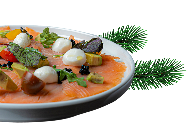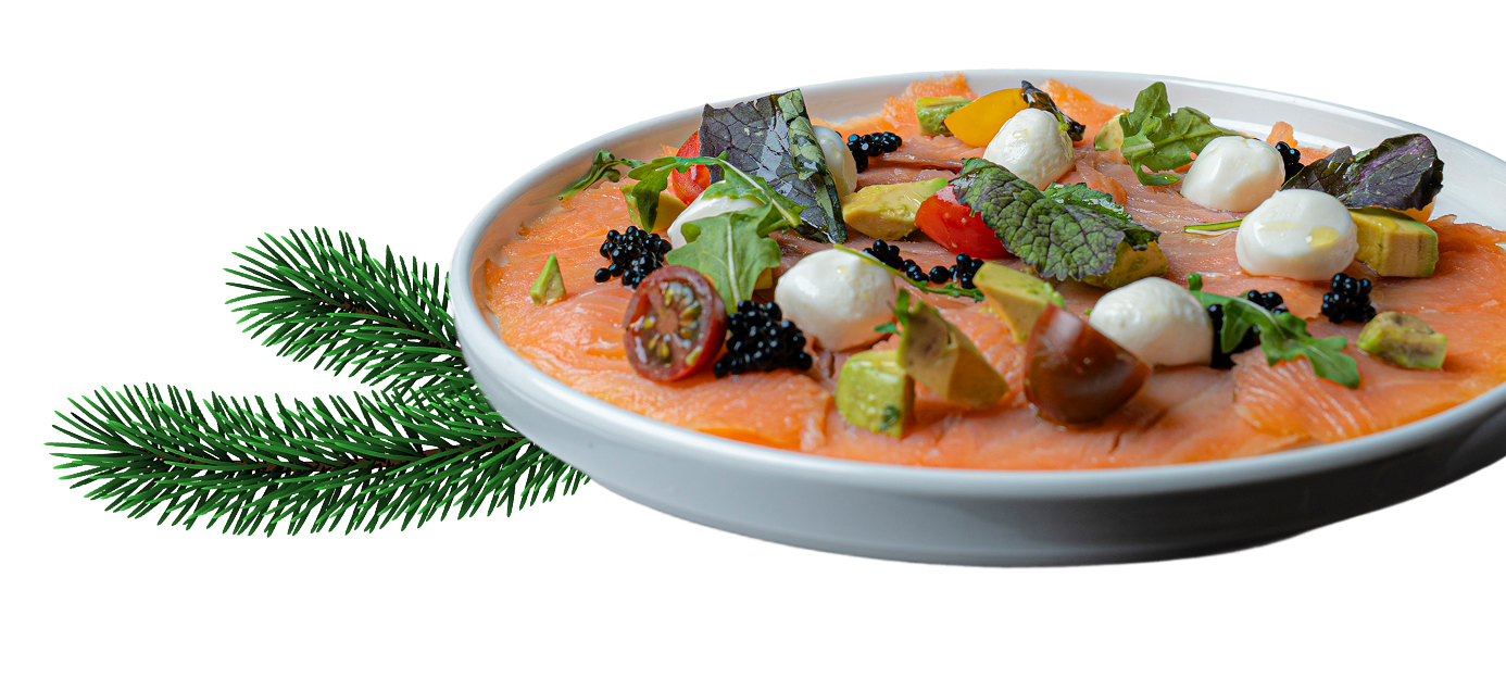 Carpaccio de Salmón ahumado con aguacate y perlas de mozzarella