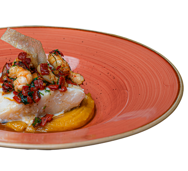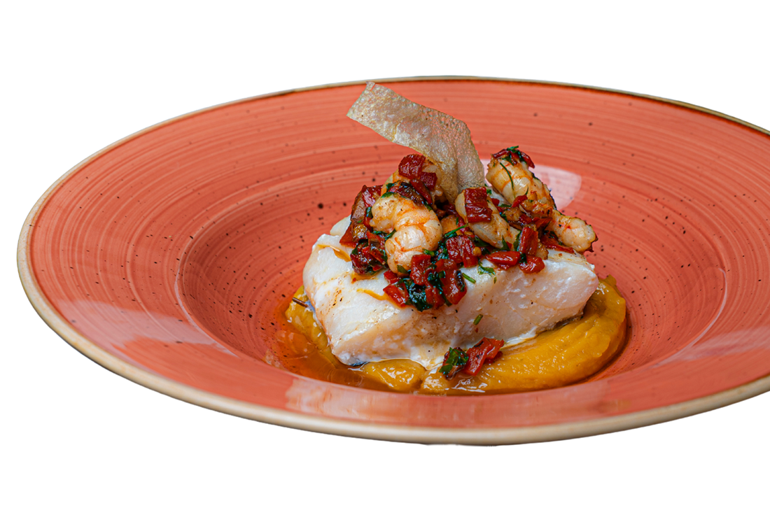 - Tronco de bacalao confitado a la bilbaína de gambas y piquillos con puré de batata